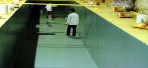 ④鋪玻織布:將玻織布放置平整,用調(diào)配好的乙烯酯中涂將玻織布粘附地面,并用批刀將乙烯酯中涂批平,使其均勻涂布,依需要做一至三層;